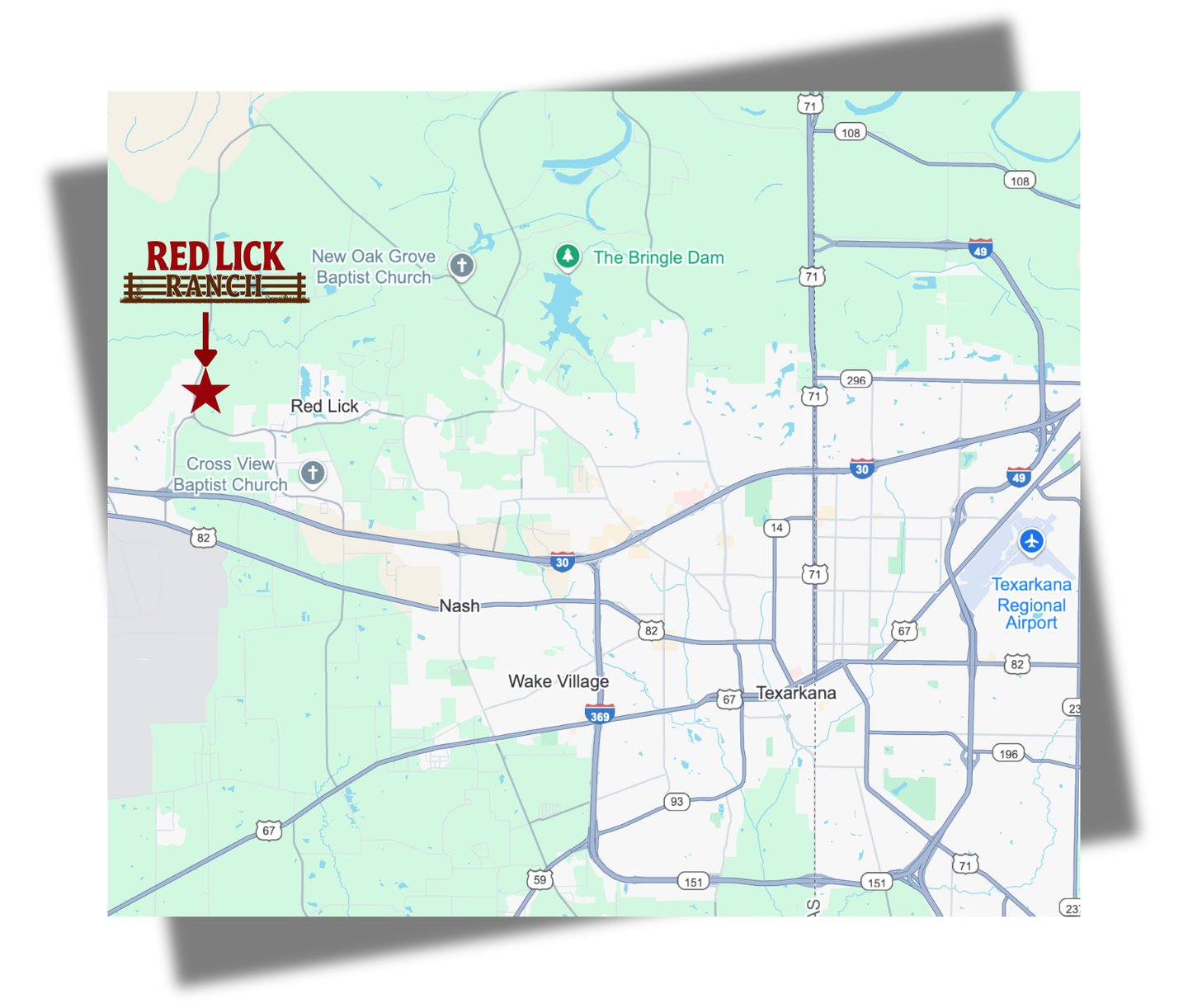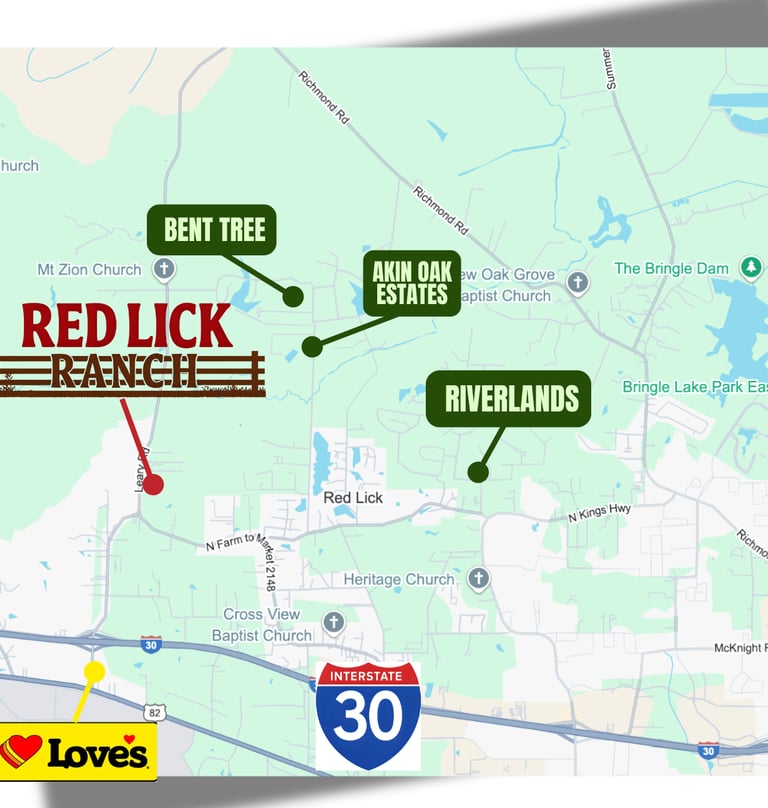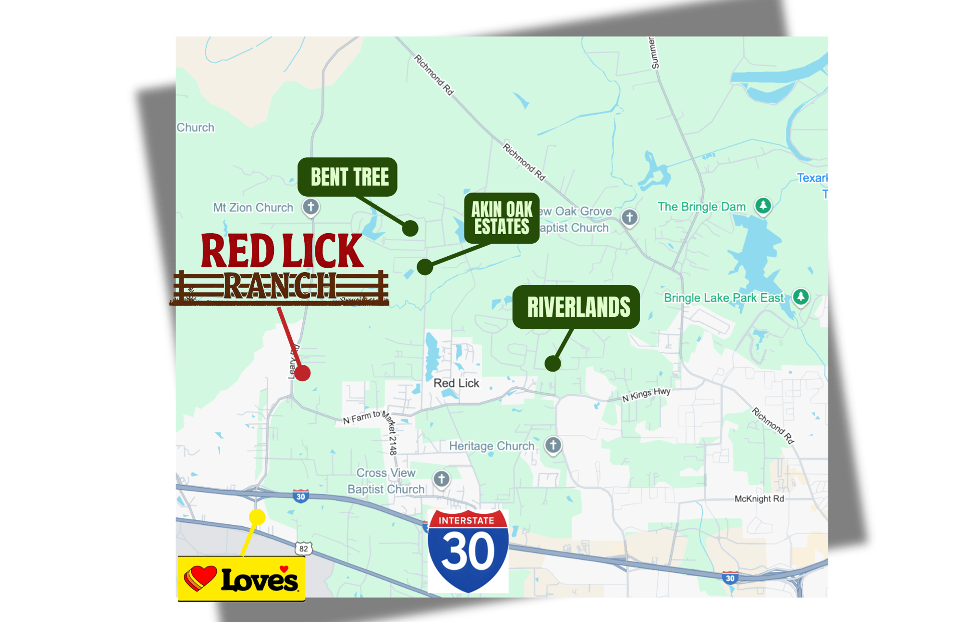 Red Lick Ranch is a new subdivision from Cleve Batte Construction and Texarkana Developers Inc and is located just west of Texarkana, Texas. Easily accessible, it is a couple of minutes from the Leary 213 exit on Interstate 30. A nearby Love's Travel Stop and Dollar General provides gas, food, and shopping. Texarkana is just a short drive away.